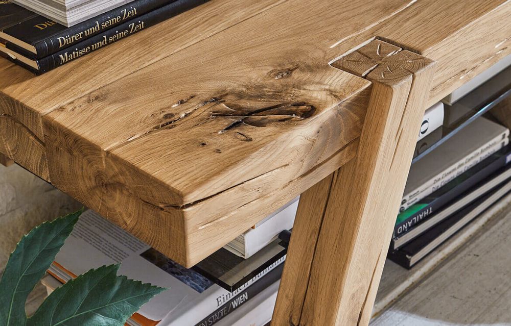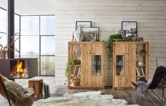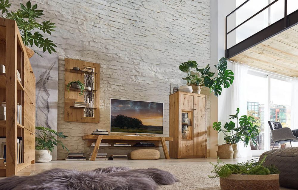 Diese Wohnwand ist ein aus markanten Kernholz der Eiche gefertigtes, ausdrucksstarkes Einzelmöbel, welches seitlich mit luftgetrockneten Eichenbalken als prägendes Stilelement überzeugt. Die natürlichen Risse der Eiche werden von Hand nachgearbeitet, wodurch ein besonders markanter Eindruck entsteht. Drei natürliche Akzente runden das Massivholzgerechte Erscheinungsbild individuell ab. Ausdrucksstarke Unikate für ein gemütliches und naturgesundes Zuhause.